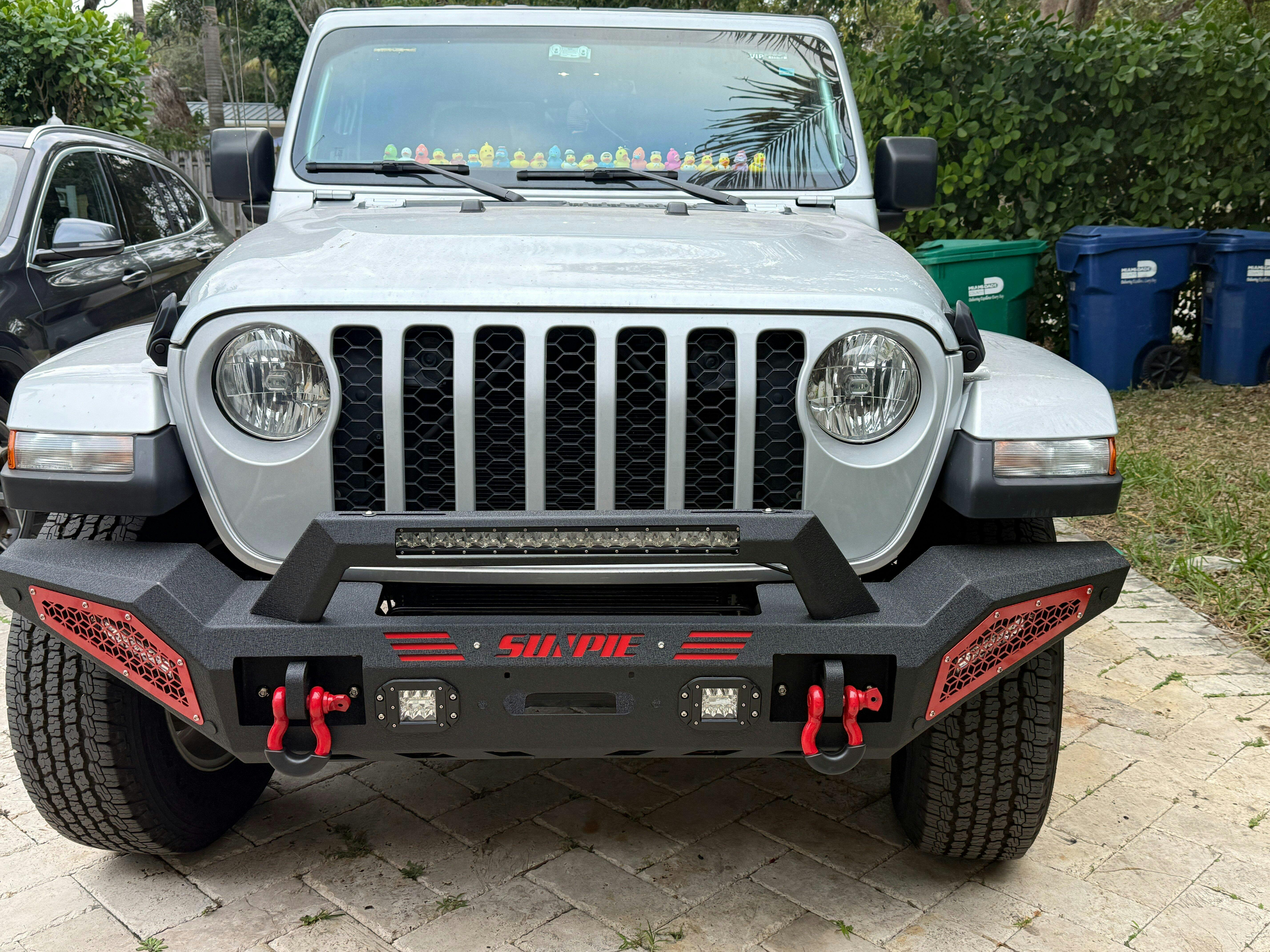 • Product Upgrade: In 2025, we upgraded our Jeep front bumper by adding a license plate bracket and re-drilling four pre-drilled sensor holes on the front bumper. If you need to use the sensor holes, simply remove the rubber plugs.