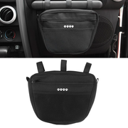 - Adjustable webbing at the top with removable, adjustable hook and loop straps. The functional storage bag hangs close to the glove box, will not in the way of the passenger, and doesn't interfere with the use of the grab bar or glove compartment.